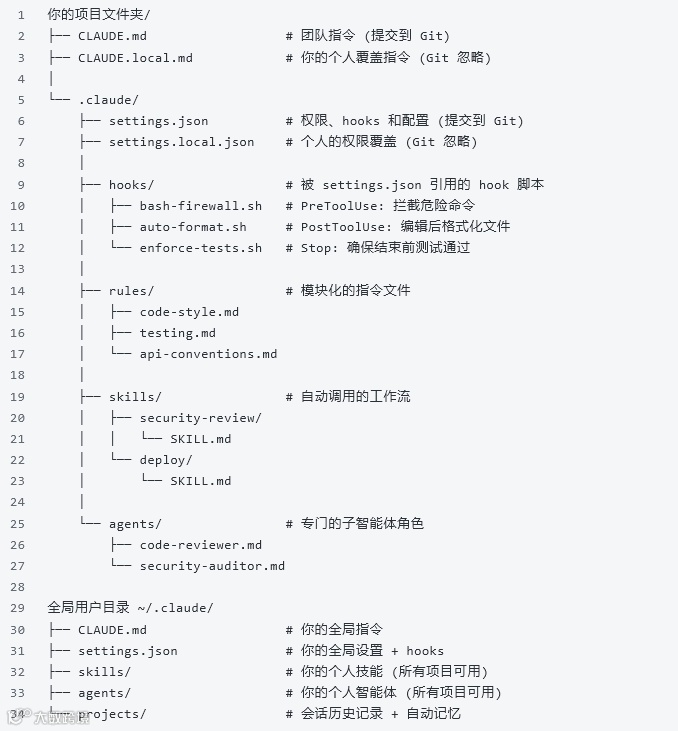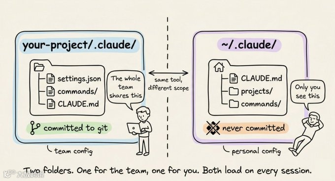 .claude 包含两个独立目录:项目根目录下用于存储团队统一配置(提交至Git仓库),主目录 ~/.claude/ 则保存个人偏好(如会话历史)。