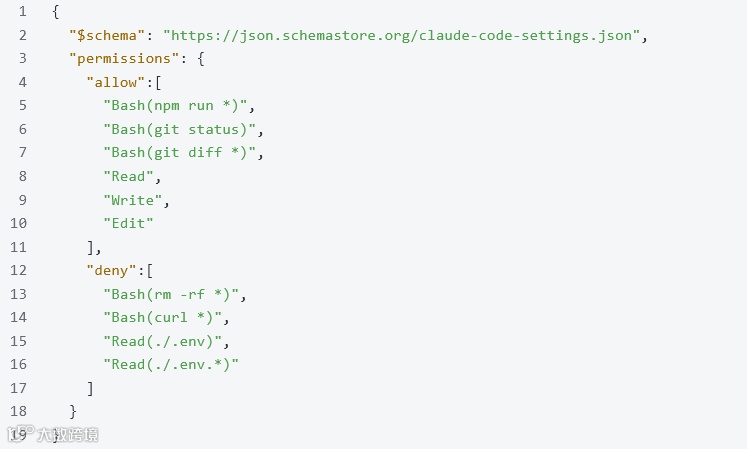 allow:免确认命令(如 Bash(npm run *), Read/Write)deny:禁止命令(如 rm -rf, .env 读取)$schema:启用编辑器自动校验(务必保留)
