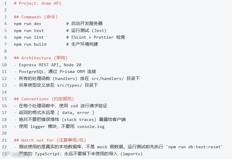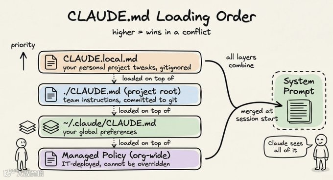 启动会话时,Claude 首先加载 CLAUDE.md 作为系统提示词,全程指导其行为。合理配置可强制模型遵循团队规范,例如:"编写代码前需先添加测试"或"禁用 console.log,改用 logger 模块"。