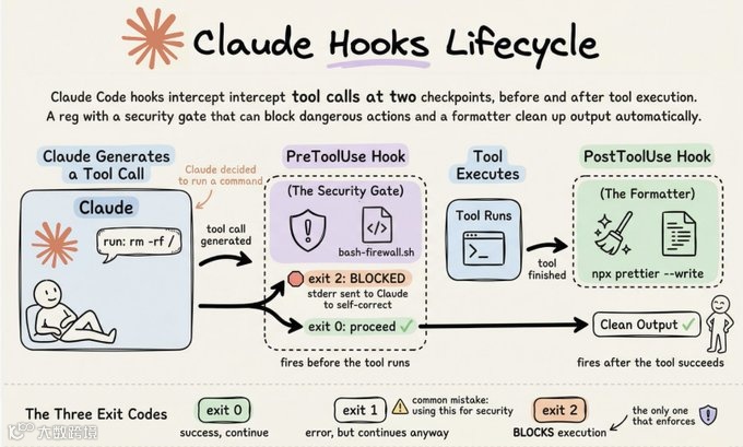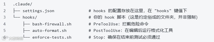 示例:Bash防火墙脚本拦截 rm -rf、git push --force 等危险命令;Stop钩子强制测试通过才确认任务完成。