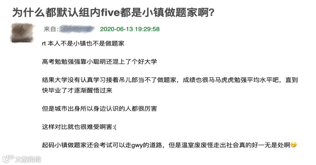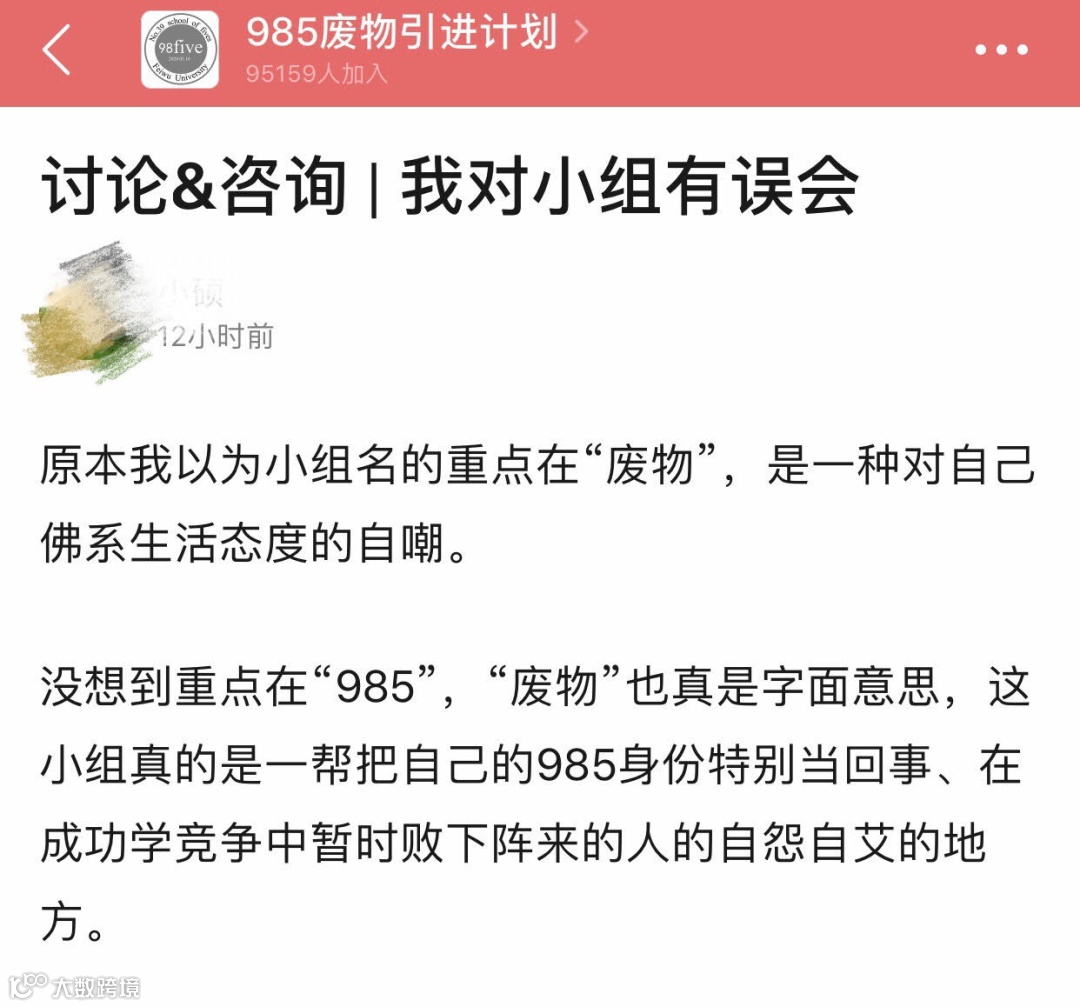 不过其实也不用为他们担心,毕竟他们缺少的只是实战经验而已。何况现在2020年,而不是1961年了。大部分自称985废物其实心里都门儿清着呢,引用小组里一个帖子的话:「 再怎么废物我们平台还就比你高了。我们重新开始的门槛也比你低,门路也比普通人多,这些都是我们之前十几年努力换回来的。既然认定高考的成功是阶段性的成功,就意识不到废物的失落也是阶段性的失落吗?」