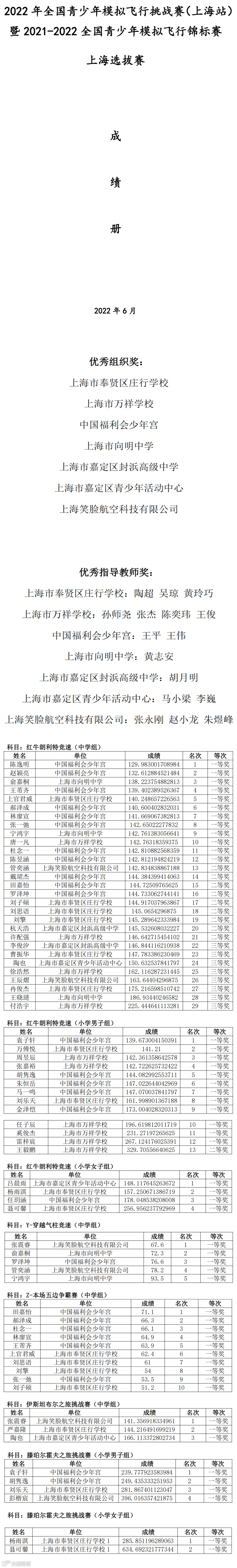 2022年全国青少年模拟飞行挑战赛(上海站)成绩册