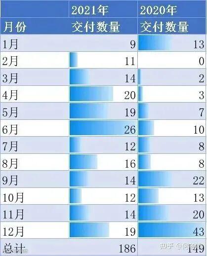 2021年共交付运输飞机186架,比去年交付量149架多出37架。