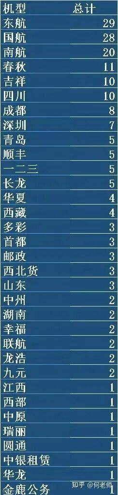 依数量排序,最多的公司为三大航及春秋、吉祥等。海航系基本没进新飞机(仅西部、金鹿公务机各1架)。