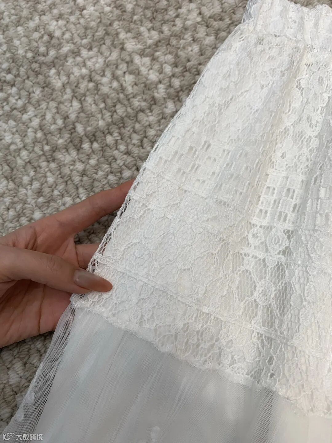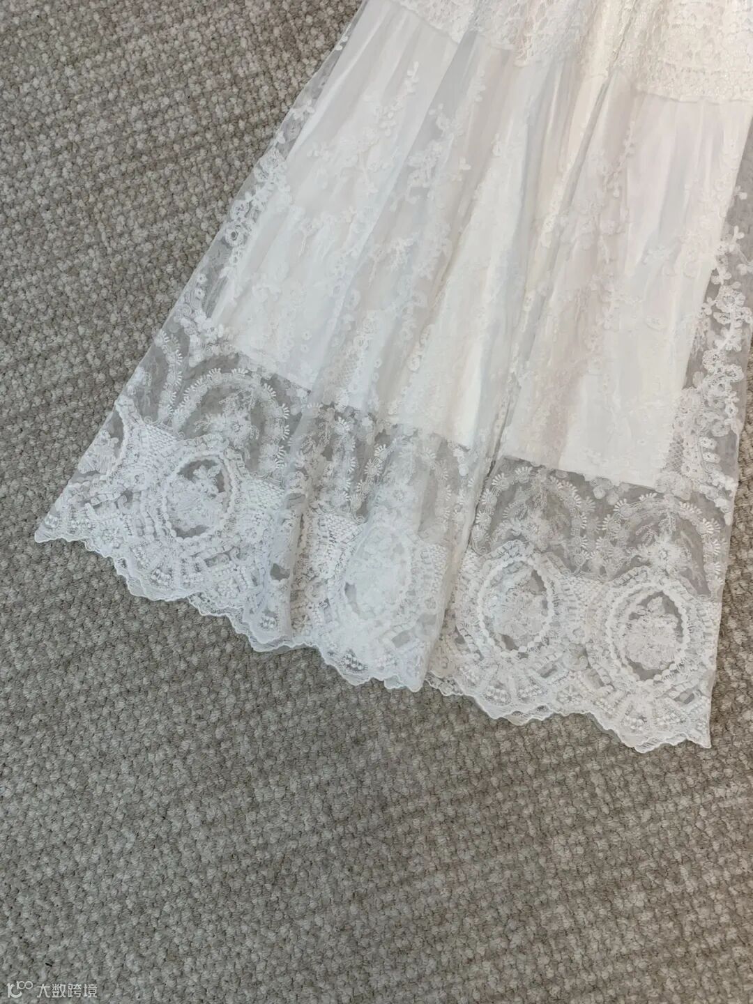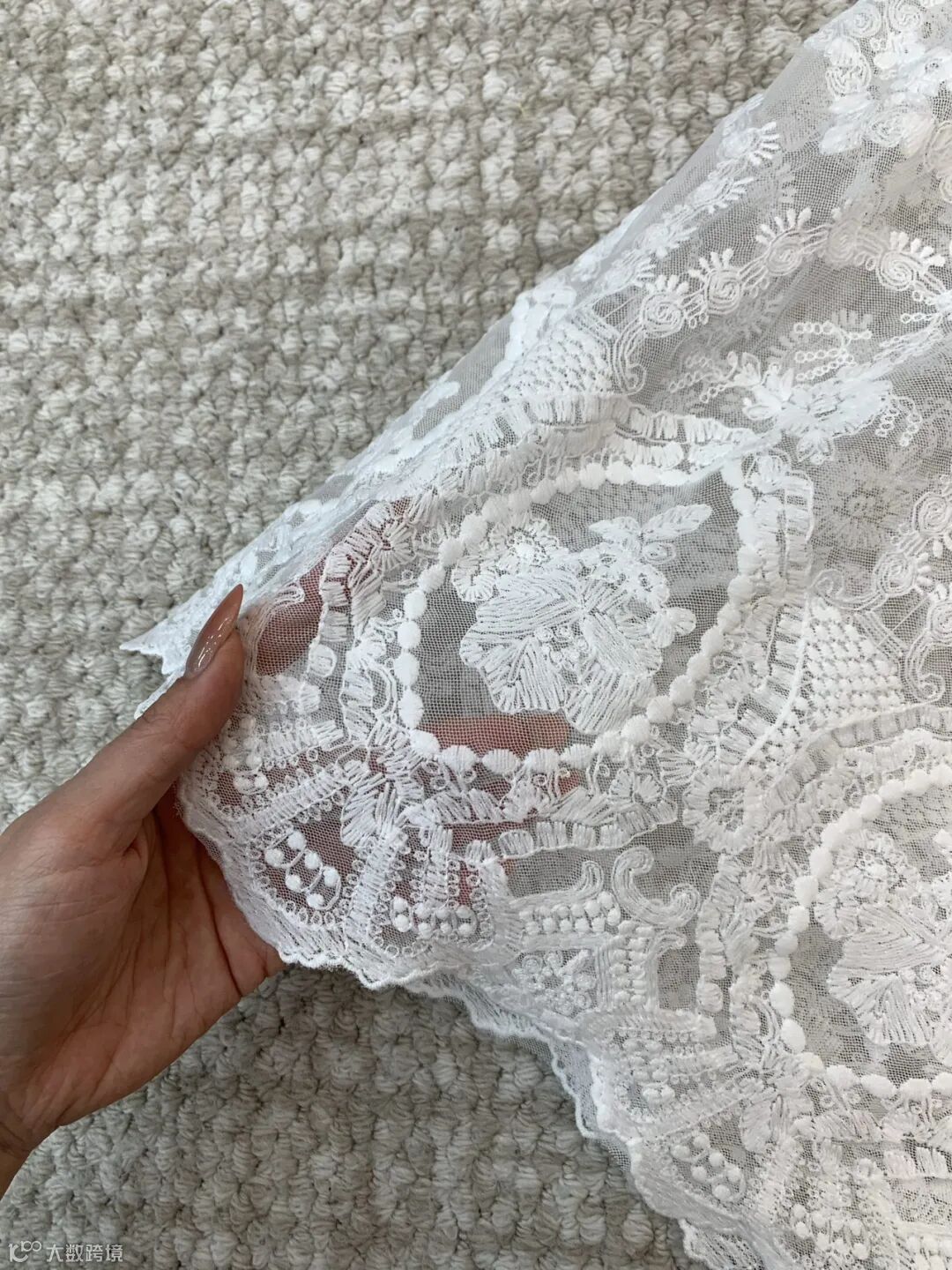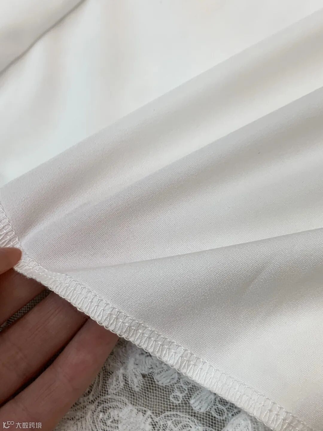 面料,外层是高支数蕾丝+轻薄网纱,摸起来软糯不扎肤,蕾丝纹理清晰立体,重工刺绣密实有光泽,内层是采用80%天丝+20%亚麻混纺工艺的衬布,避免透肤尴尬,贴肤丝滑,舒适透气,不闷汗、不粘身。