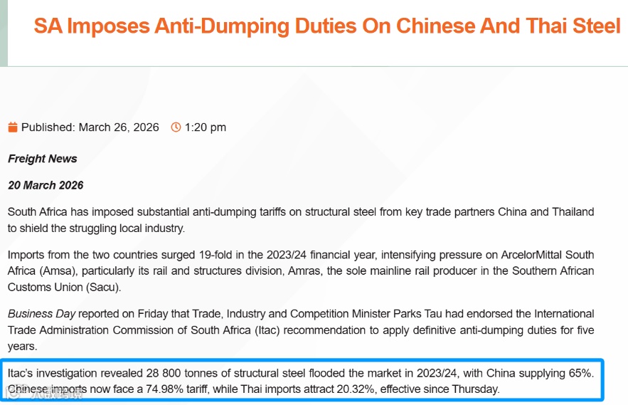 南非国际贸易管理委员会(ITAC)近期裁定,对原产于中国的建筑结构用U型钢、I型钢、H型钢等型钢产品征收74.98%的反倾销税。该措施适用于整个南部非洲关税同盟(SACU)成员国——南非、博茨瓦纳、纳米比亚、莱索托和斯威士兰,形成区域统一贸易壁垒。此举使中国钢企丧失价格优势,同时凸显钢铁出口面临贸易壁垒的现实,也隐含非洲市场新机遇。