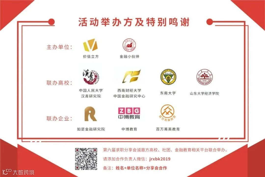 在此鸣谢价值立方、金融小伙伴主办,如是金融研究院、中博教育、百万菁英教育、中国人民大学汉青研究院、西南财经大学中国金融研究中心、东南大学、山东大学经济学院做为联合举办方的大力支持,在指导大学生积极正确的路上,我们一同前行。