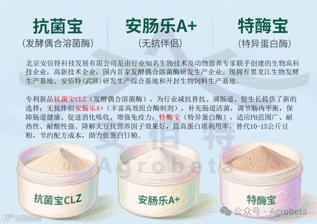 安佰特“无抗黄金组合”(抗菌宝CLZ+安肠乐A+特酶宝)具有协同增效作用。其中,特酶宝包含植酸酶、特异蛋白酶等多种高效复合酶,通过分解饲料中的抗营养因子(如植酸磷),提高饲料利用率,减少氮排放,其耐高温特性与抗菌宝的抑菌功能形成互补,共同保障饲料加工过程稳定性。安肠乐A+通过调节肠道菌群平衡,增强动物免疫力,与抗菌宝的抑菌作用形成“抑害护益”协同机制。不同畜禽水产等动物实际生产应用表明,无抗黄金三组合通过多组分协同作用实现养殖场综合效益提升。安佰特“无抗黄金组合”协同增效研发思路体现了技术路径互补(分子改造+酶解+微生态调控)、功能靶点覆盖(抑菌、抗炎、营养、免疫)及综合问题解决能力(降本、增效、环保)三个维度。其设计逻辑符合“新质生产力”理念,通过多组分协同突破了单一产品的效能瓶颈。