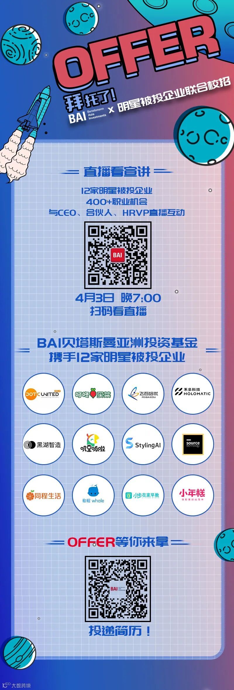BAI(贝塔斯曼亚洲投资基金)联合12家明星被投企业,全面开启2020年度校园招聘!本次校招,共有来自工业互联网、自动驾驶、线上教育、生鲜、社交、出海等多个领域的12家BAI明星被投企业参加,60+职位同步发布,400+岗位等你来申。