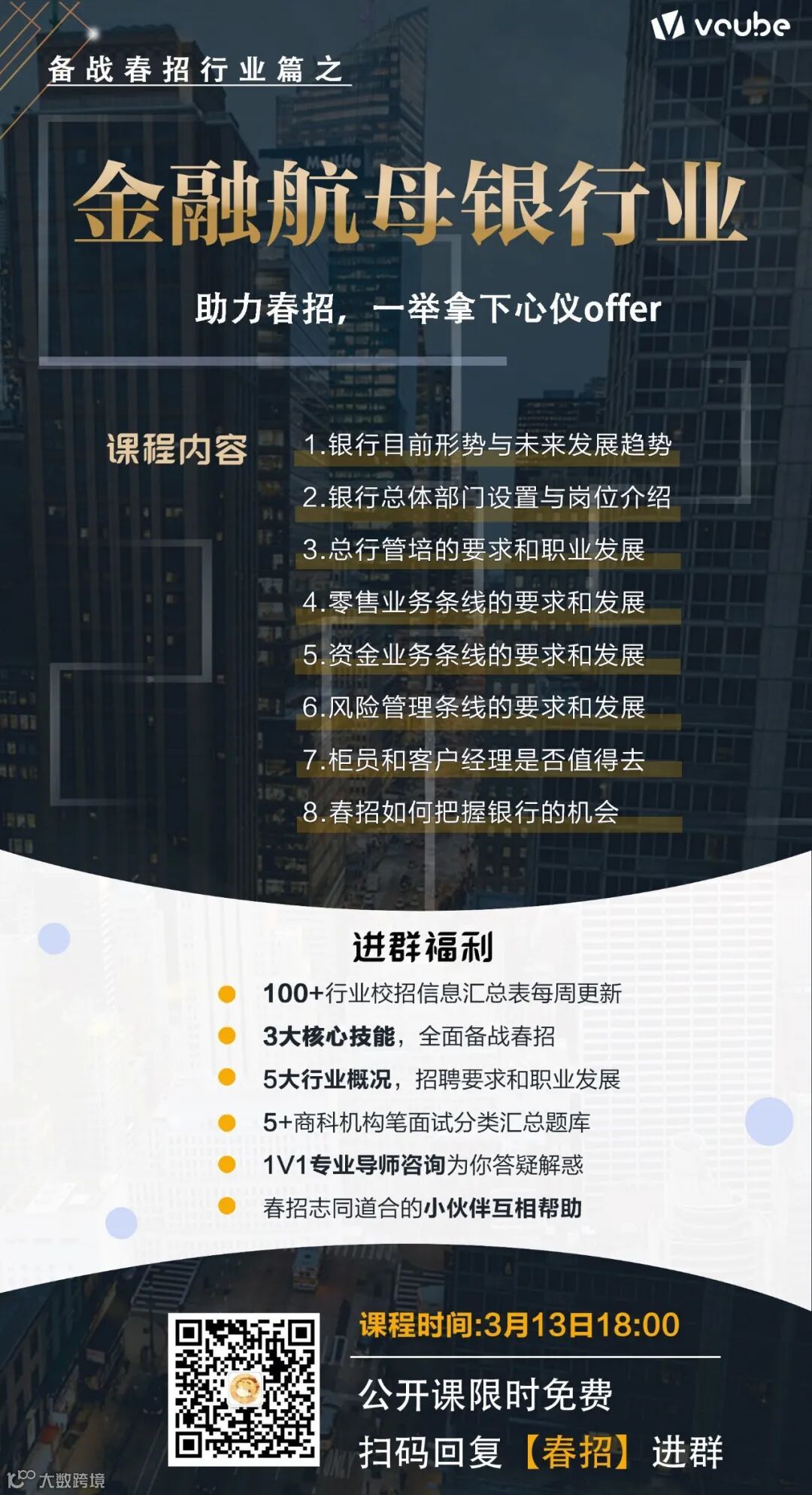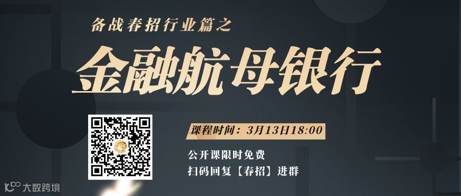 邀请到大咖导师深入讲解银行业目前的形势和未来发展趋势,各业务线的岗位要求和职责,选择最适合自己的岗位,回复“春招”即可进群免费收听!