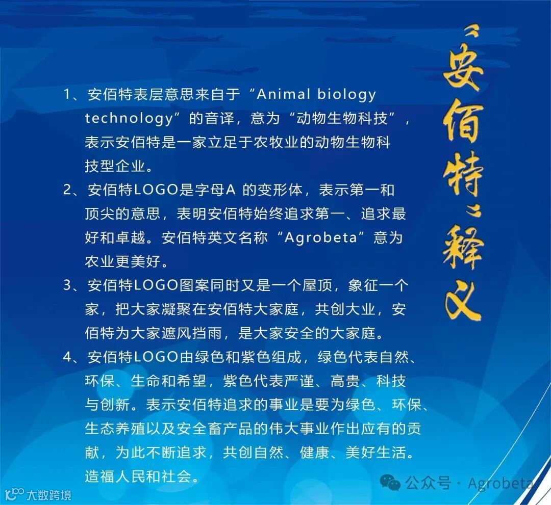 以“开创农牧生物产品效能新时代”为目标,安佰特致力于原创性技术、产品和应用研究,在国内率先研发生产发酵溶菌酶,已形成了菌酶饲料添加剂、生物发酵饲料、动保生物制品和环境改良剂四大系列,十多种饲用单酶和饲用单菌、数十种创新型复合酶和复合微生态制剂组成的产品体系。