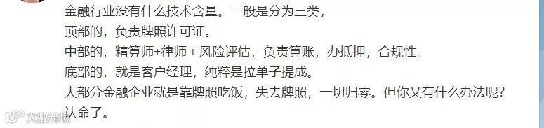 来讽刺金融行业根本没有技术含量,大部分金融企业就是靠牌照吃饭。