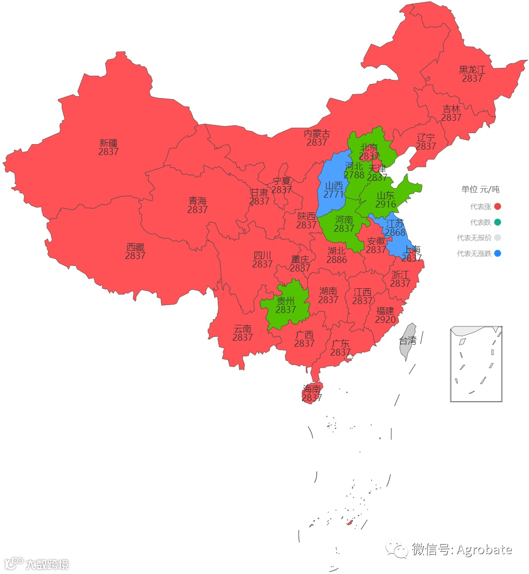 导读:按行政省采集不同样本点价格信息,计算玉米、豆粕大宗原料当日采购均价。 信息来自中国饲料行业信息网、Mysteel、百度爱采购等。供参考。