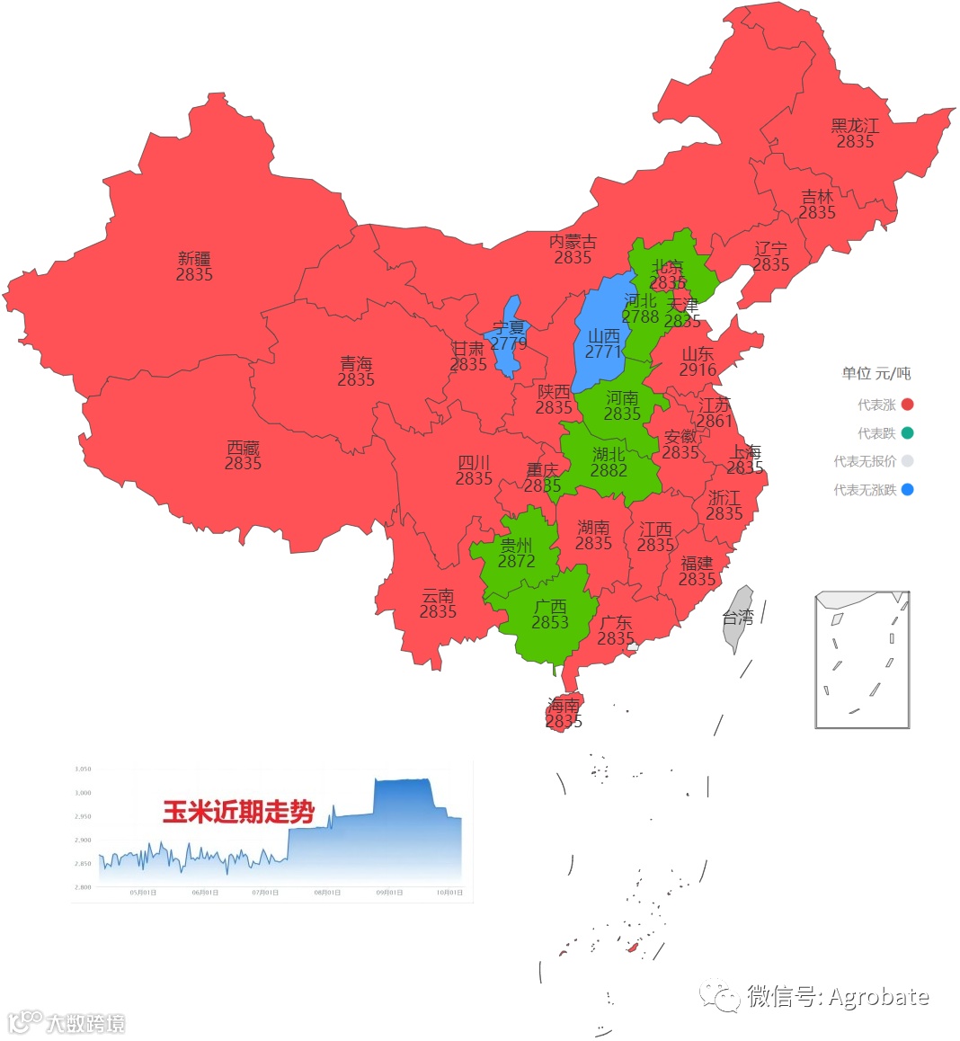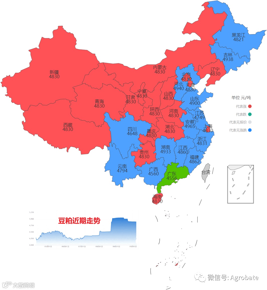 导读:按行政省采集不同样本点价格信息,计算玉米、豆粕大宗原料当日采购均价。 信息来自中国饲料行业信息网、Mysteel、百度爱采购等。供参考。