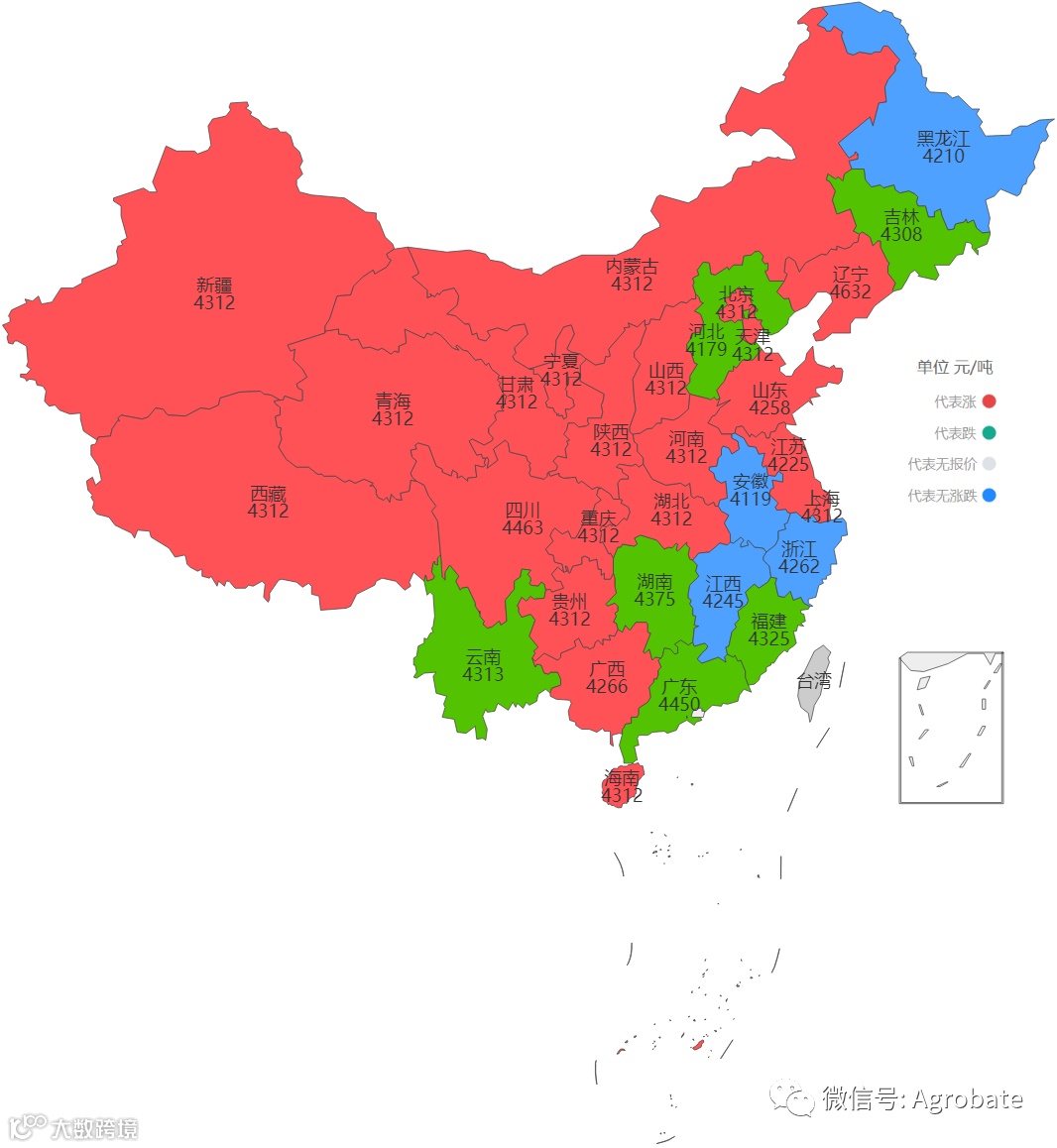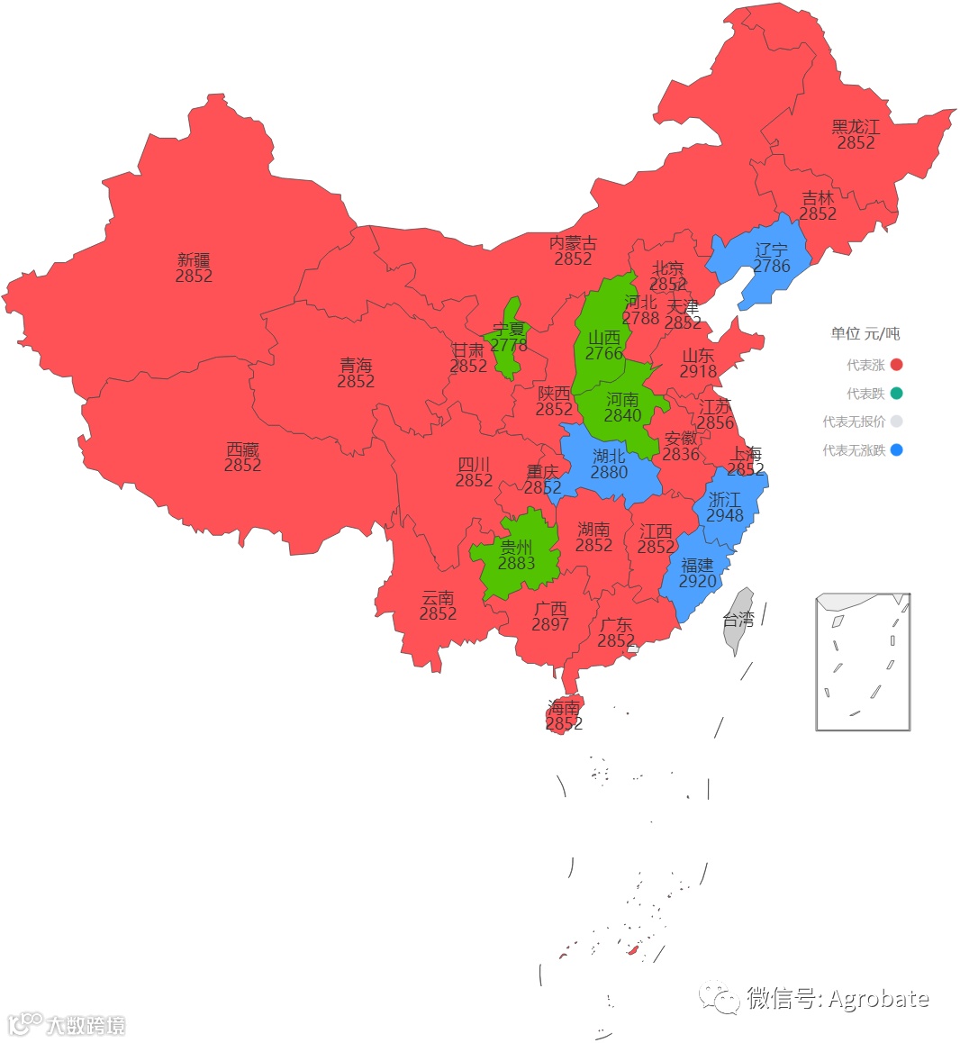 以省为单位,监测价格变动,指导玉米豆粕大宗原料采购决策。价格信息来自:饲料行业信息网。报价截止时间11:30,统计时间不同会造成当日价格有小幅差异。