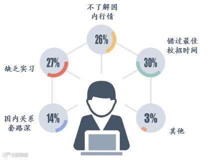 根据金融小伙伴发布的《2018年应届生求职调查报告》显示,约有27.11%的海归同学认为他们在国外学习期间课程较紧,回国不方便,所以缺乏国内机构实习经验(特别是长时间有深度的实习经历)。