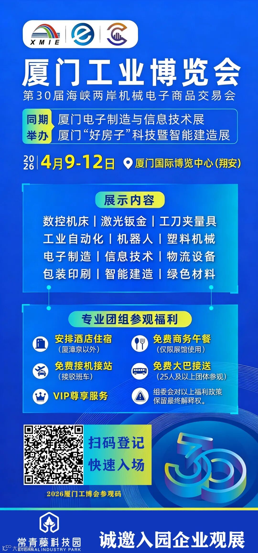 以“30载厚积 向新而行”为主题的2026厦门工业博览会暨第30届海峡两岸机械电子商品商品交易会(简称“厦门工博会”)将于4月9-12日在厦门国际博览中心举行。本届展会延续“1+N”展览架构,覆盖从基础材料到智能装备的全产业链条,聚焦工业智造前沿趋势。