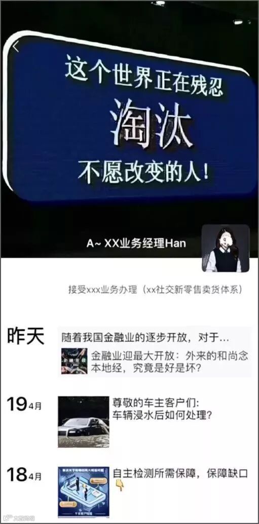 点开个人头像进去后,发现每条朋友圈都是早安问候,甚至定位都是 xx · 业务找小J,但感觉没有一条是发给老同学看的。