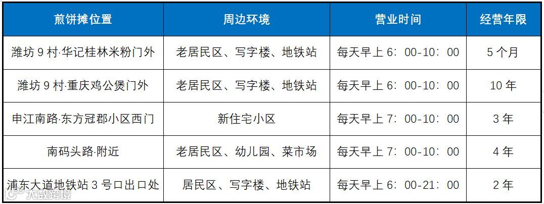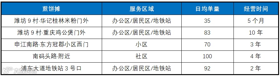 下图是我们对浦东新区的5家煎饼摊进行的实地调研情况,结果也证实,目前我们见到的大多数煎饼摊营业时间都在早上6点到10点之间,其中高峰时段基本在7点9点之间。