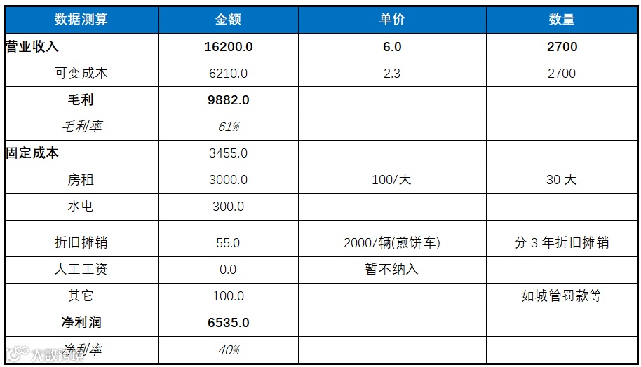 我们还是以老刘的煎饼摊为例,工作日老刘每天可以卖100个煎饼,周末是工作日的一半,即50个/天,算下来1个月基本可以卖2700个饼,按照客单价6元,老刘1个月收入1.6万,除开各项成本,每个月拿到手的利润是6500元。