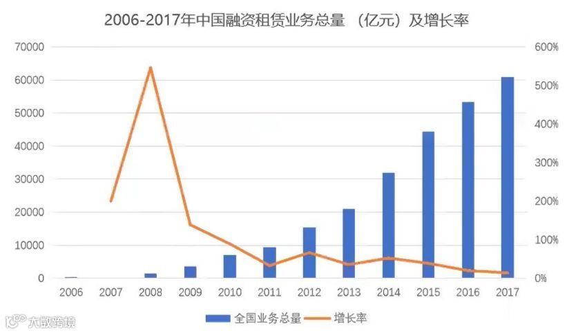 2015年,我国融资租赁年交易额1365亿美元,全球排名第二,仅次于美国,增速达25.6%,居于首位。从业务总量看,2017年底全国融资租赁合同余额约为60600亿元,比16年增长13.7%。各项数据都显示,金融租赁行业发展很快,并且体量已经不容小觑。