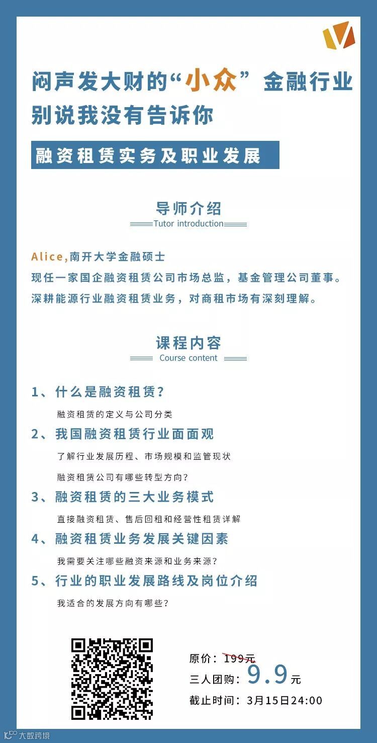 但是鉴于融资租赁较为“小众”,很多想从事金融类工作的同学,对此并不了解,因此有人称其为“闷声发大财”的行业。如果你想要深入了解这个行业的业务及发展方向,可以参加我们新推出的《融资租赁实务及职业发展》课程,限时拼团9.9元即可收听~