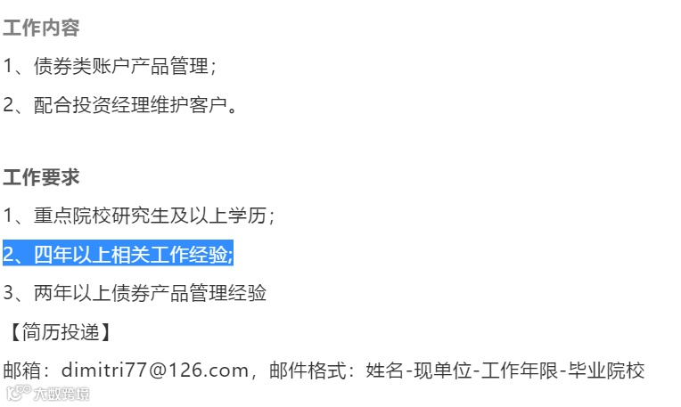这是中信证券固定收益部招聘投资顾问组产品经理的一则启事。里面要求的“四年以上相关工作经验”并非指你毕业后工作4年就够了,而是指在相关领域工作4年,即PQE为“4”。