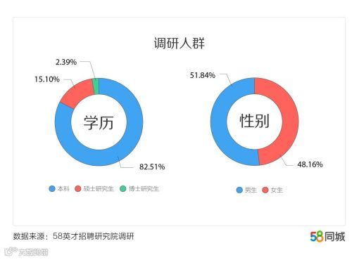 本次参与调研的大学生来自国内一线、新一线等60个城市、291所高校,与去年相比,高校样本的覆盖范围更大。在大学生样本人群中,本科学历占82.51%、硕士研究生占15.10%、博士研究生占2.39%,女生占比51.84%、男生占48.16%。