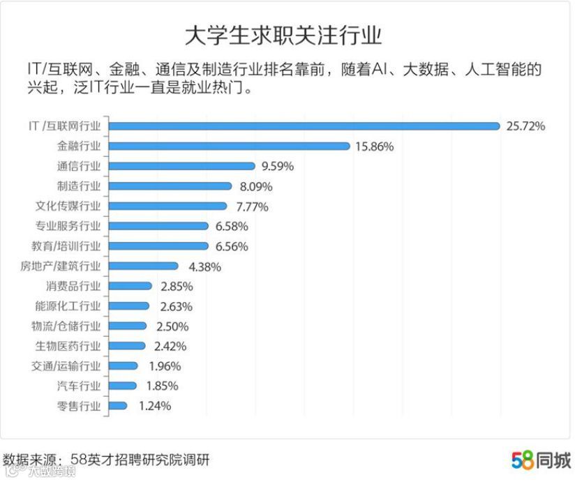 从大学生求职首选行业来看,IT/互联网、金融、通信及制造行业排名靠前。随着AI、大数据、人工智能的兴起,泛IT行业一直是就业热门,而金融、通信行业由于收入高、工作环境好,成为大学生心目中的理想选择。与此同时,随着近年来制造业转型升级,由中国制造向中国智造迈进,制造业热度上升,更多大学生愿意投身制造业。