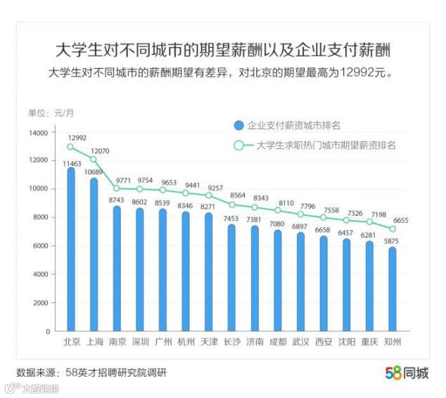 在求职热度最高的十五个城市中,大学生期望薪资排名前三位的依次是北京、上海、南京,平均期望薪资分别为12992元/月(近1.3W/月)、12070元/月、9771元/月。企业支付薪资排名前三的城市为北京11463元/月、上海10689元/月、南京8743元/月。