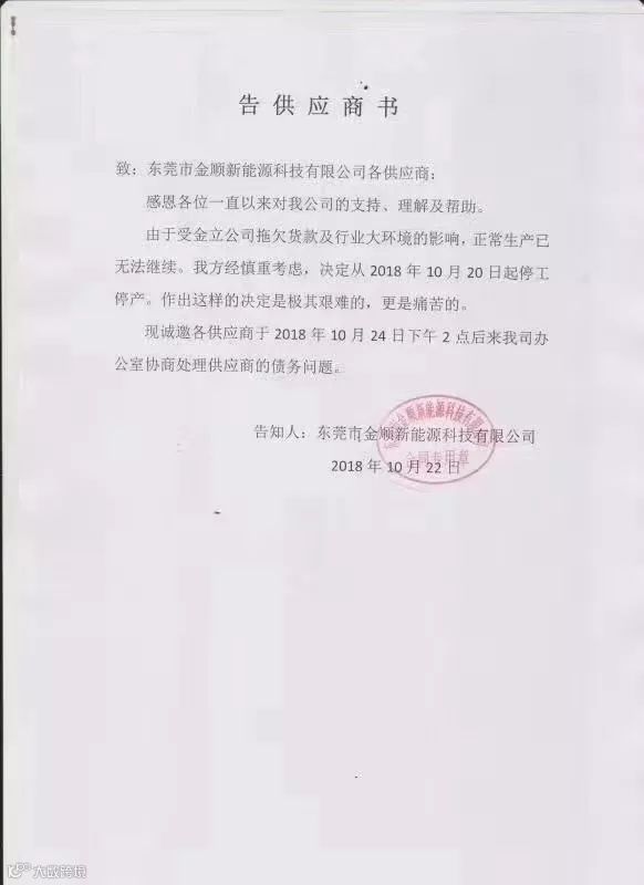 10月22日,东莞市金顺新能源科技有限公司发《告供应商书》称:“由于受金立公司拖欠货款以及行业大环境的影响,正常生产已无法继续,我方经慎重考虑,决定从2018年10月20日起停工停产。”(图片来源:第一财经日报相关报道)