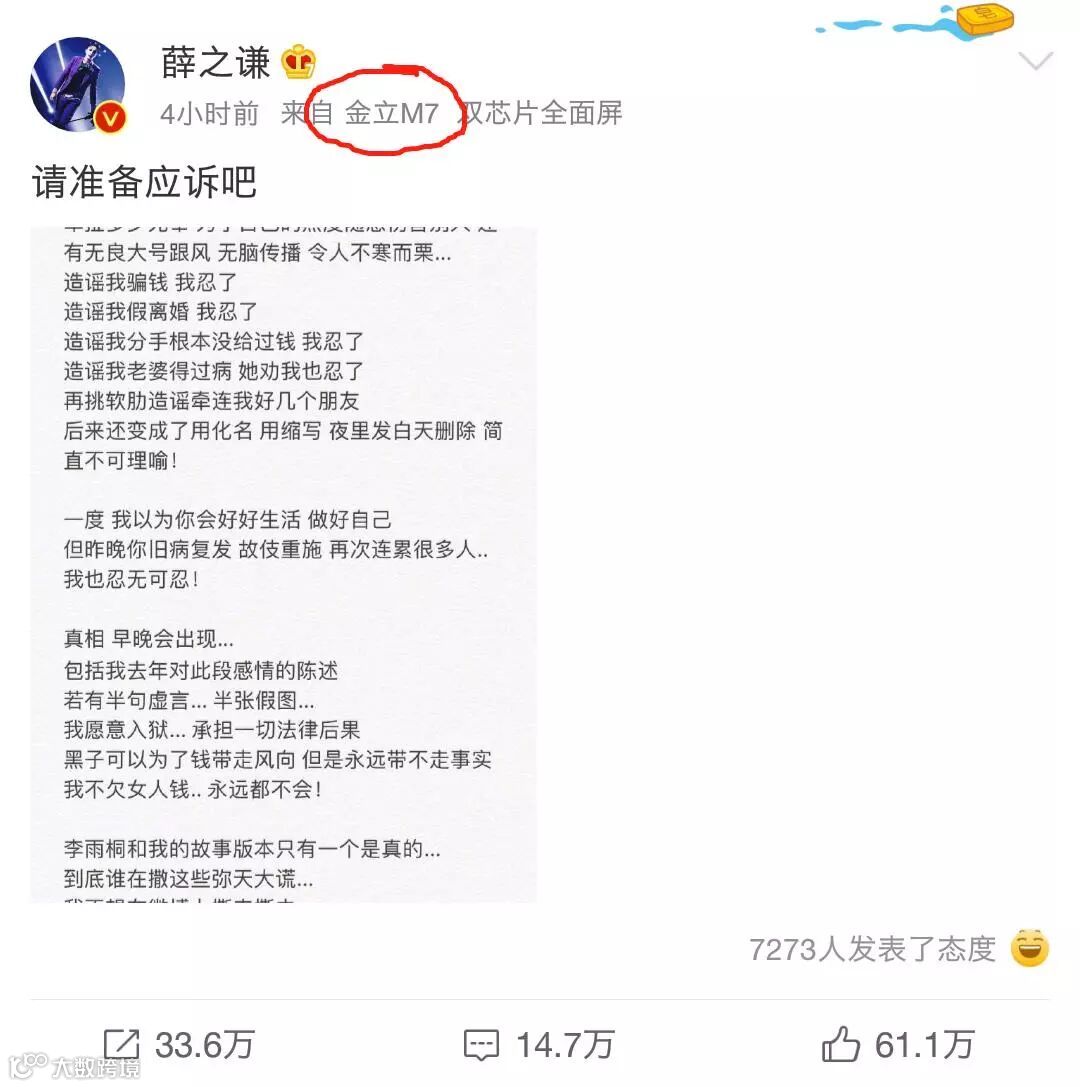 刚写完这篇文章,正在刷微博,忽然看到薛之谦发的这条热搜用的正是金立M7。薛之谦代言过金立,而这款手机是去年金立发布的一款全面屏旗舰机。