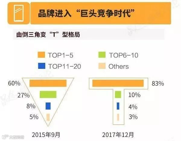 留给金立的时间不多了,国内手机市场正由过去的倒三角形转变为T字形格局。从2017年的全球出货量来看,小米有将近1亿台,而“二线品牌”金立却只有2700万台,这种差距还将继续扩大。