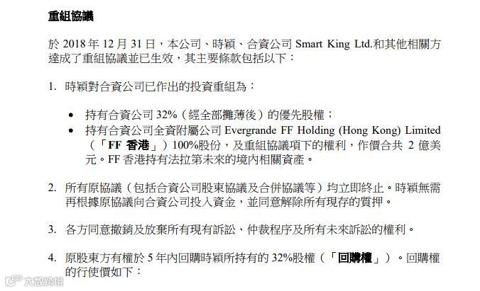 据公告,恒大健康与时颖、Smart King Ltd.和FF Top Holding Ltd.等达成的重组协议于2018年12月31日生效,主要条款包括:时颖持有Smart King Ltd.公司32%(经全部摊薄后)的优先股权;持有Smart King Ltd.全资附属公司Evergrande FF Holding (Hong Kong) Limited(指“FF香港”)100%股份,及重组协议项下的权利,作价合共2亿美元。其中,收购 FF 香港的作价为1亿美元。FF香港持有法拉第未来的境内相关资产。