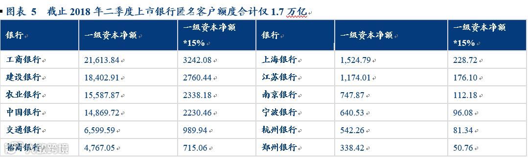 1、匿名客户大额风险暴露额度有多少?匿名客户算作非同业单一客户,不得超过银行一级资本净额的15%。按照银监会公布数据,截止2018年二季度末,商业银行一级资本净额合计14.47万亿,则匿名客户大额风险暴露额度上限是2.17万亿。