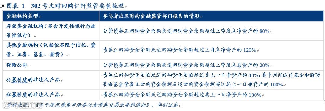 文件中主要的监管指标约束在于对债券回购杠杆率水平的限制。根据302号文第九条的监管要求,各类型机构债券业务需满足不同比例的正逆回购杠杆比例,具体要求如图表1所示。需要注意的是,302号文对金融机构自营业务和资管业务都有相应的杠杆要求,而资管新规仅对表外资管业务的杠杆比例作出限制,所以302号文的实际影响更广。具体来看,2014年7月证监会发布的《公开募集证券投资基金运作管理办法》已限制公募基金总资产不能超过净资产的140%;2016年证监会新八条底线要求非结构化集合资管产品总资产不能超过净资产的200%;资管新规对私募资管产品的杠杆比例也统一限制为200%,所以302号文对非法人产品的影响相对较小。