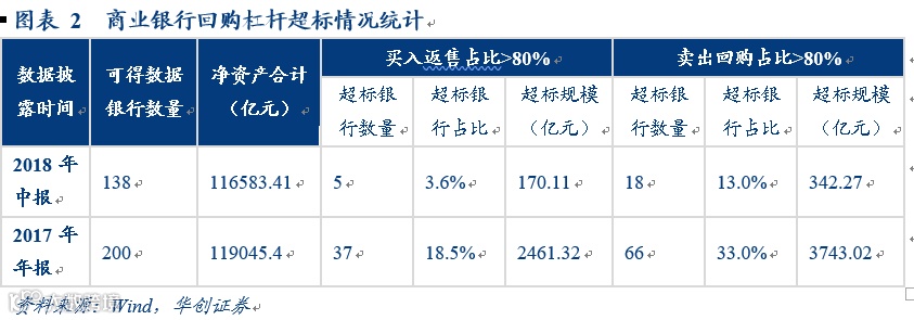 由图表2数据可见,随着今年以来银行业务的整改,银行自营整体杠杆水平出现了较为明显的回落,2018年中报无论是资金融入比例还是资金融出比例,超标银行的数量占比和超标规模较2017年年报均出现了较为显著的下降,这与我们跟踪的月度托管量数据所计算的商业银行债券杠杆的走势是相一致的。这一方面得益于监管政策实施的扎实推进,另一方面可能也与披露中报数据的银行数量较少有一定关系。