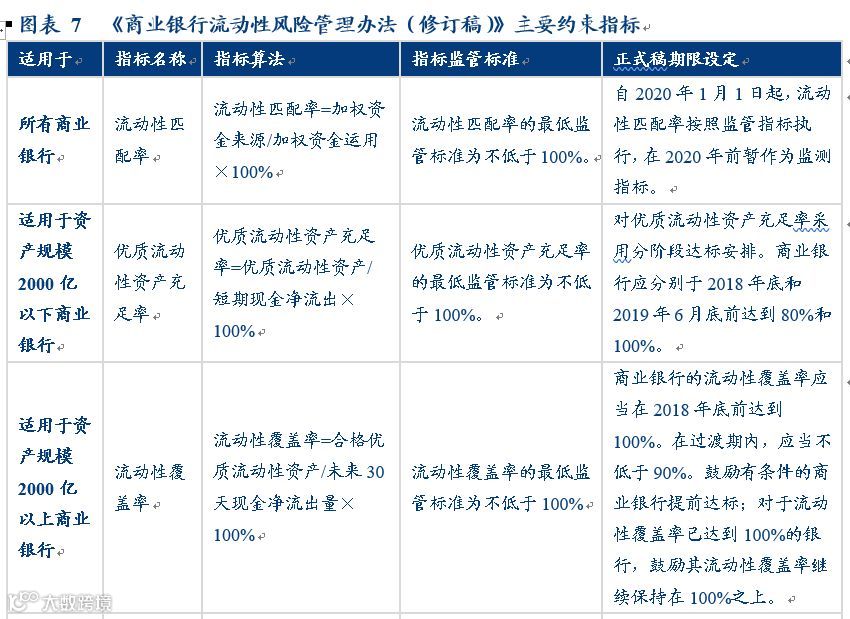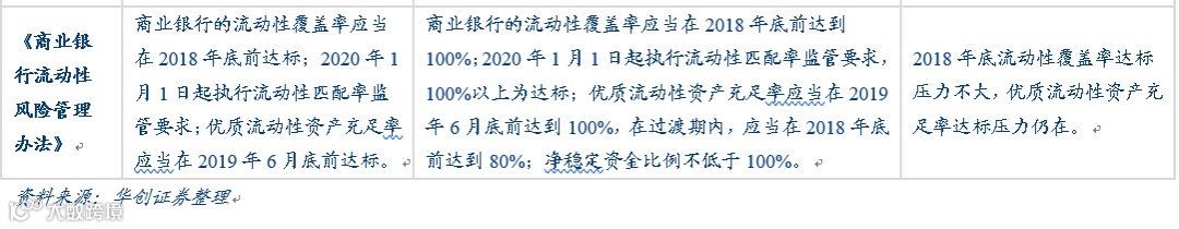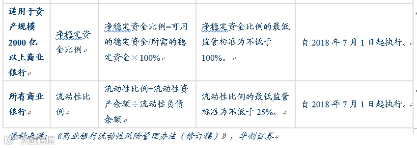 《商业银行流动性风险管理办法(修订稿)》在征求意见稿发布5个多月后,2018年5月25日正式发布,2018年7月1日起正式实施。在老版本的流动性风险管理办法基础上,修订稿新引入了净稳定资金比例、优质流动性资产充足率、流动性匹配率三个监管指标,意在对商业银行的流动性风险进行更加全方位的监管,并进一步抑制同业业务的发展。(有关流动性风险管理办法各项指标的计算方法,可参考我们过去撰写的MPA和流动性系列专题报告,篇幅所限在此不再赘述)