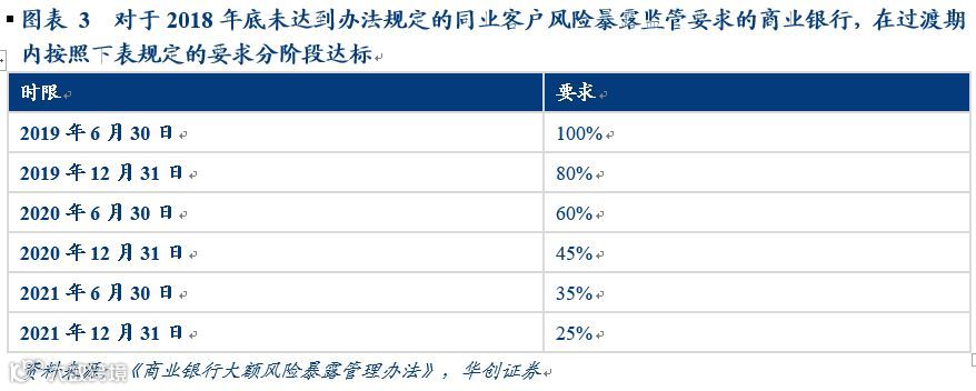 《办法》根据银行业务整改的难易程度,针对不同类别的大额风险暴露制定了不同的时间节点要求,具体而言,《办法》要求商业银行应于2018年12月31日前达到办法规定的大额风险暴露监管要求,对匿名客户的风险暴露应于2019年12月31日前达到办法规定的大额风险暴露监管要求;对同业客户风险暴露未达标银行,给予三年过渡期,设定期限为2021年12月31日,并以半年为单位分阶段达标。