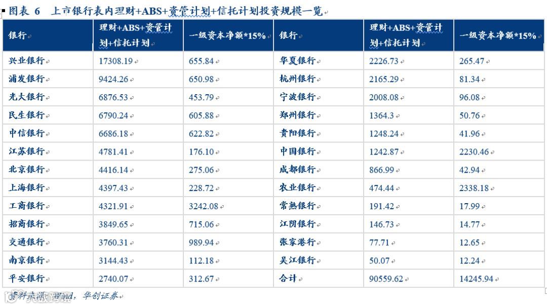 2、银行持有的不可穿透的资管产品以及资产证券化产品有多少?我们统计了上市银行半年报中披露的理财、基金、ABS、资管计划以及信托计划投资规模,25家银行匿名客户风险暴露额度合计1.42万亿,但这些银行投资理财、基金、ABS、资管计划以及信托计划的规模高达9.06万亿。即使当中有一部分可以穿透从而不计入匿名客户,但不可穿透的资管产品和资产证券化产品的规模依然远远大于匿名客户的额度。除了本文列出的25家银行外,其他数以千计的中小银行一级资本净额更少,又是委外投资的主力军,匿名客户额度不足的压力只会更大。因此可以看出,匿名账户监管指标达标压力非常大。