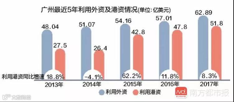 港资是广东改革开放最大的助推器,香港是广州最重要的外资来源地。这一数字除了在2013-2014年遭遇低谷,之后迅速拉升,它凸显了广州与香港的高关联度。