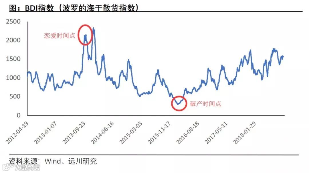 从图中我们可以看出,李云峰和徐若瑄相识的时候,正好处于航运业景气高点,而没过多久,航运景气度就随着欧债危机和中国经济低迷,一路走低,到了2016年4月,传出了李云峰公司破产的消息,此时正好是行业周期低点。