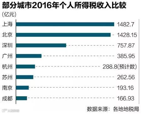 以2016年为例,个税收入首次突破万亿大关,达到10089亿元。分城市来看,上海以1482.7亿元的个税收入位居榜首,北京以1428.15亿元紧随其后。