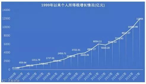 为了更全面的反映中国的个税收入增长情况,查了国家统计局1999年至今的数据(无1999之前的数据)见下图。