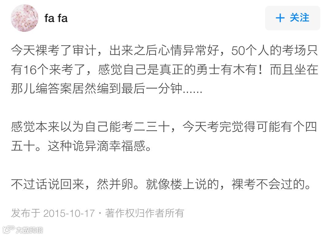 还有相当一部分同学发现情况不对,果断“战略性放弃”,所以考过CPA的人都知道,每次开考,考场上总会有几个座位是空着的,然后越考越空,能坚持到最后的要么是准备充分,要么是心理素质过硬bu pa da ji。