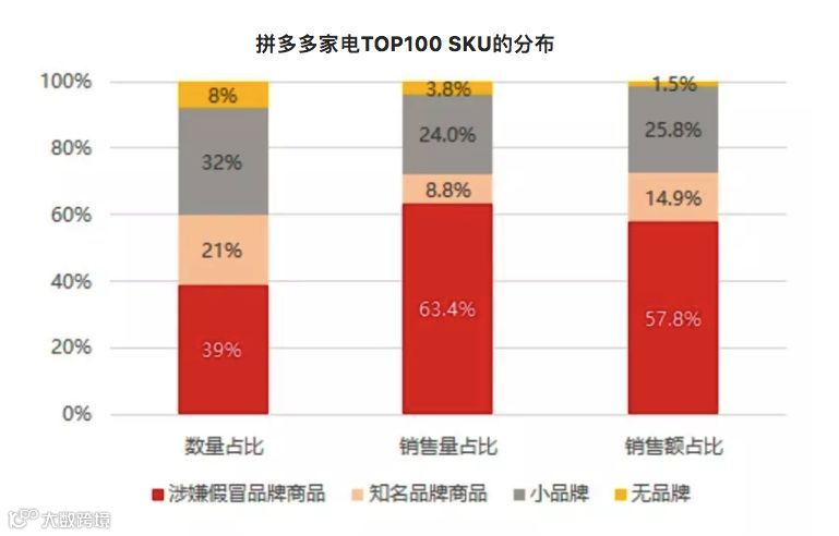 这100个家电产品前30个交易日的交易额合计7923万元,销售量13.71万台。涉嫌假冒品牌的商品共39个,该39个品牌销售额合计占比57.82%,销售量占比63.37%。