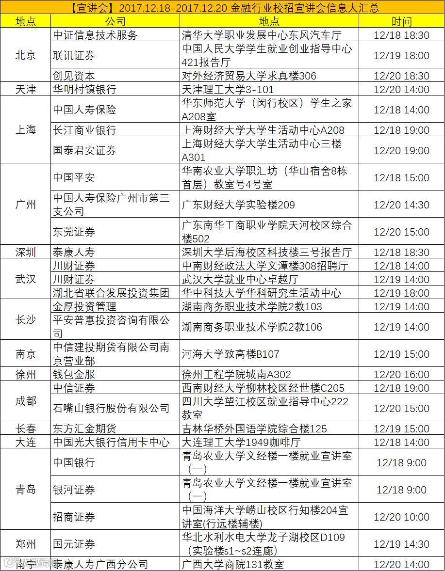 【宣讲会】2017.12.18—2017.12.20金融行业校招宣讲会信息大汇总