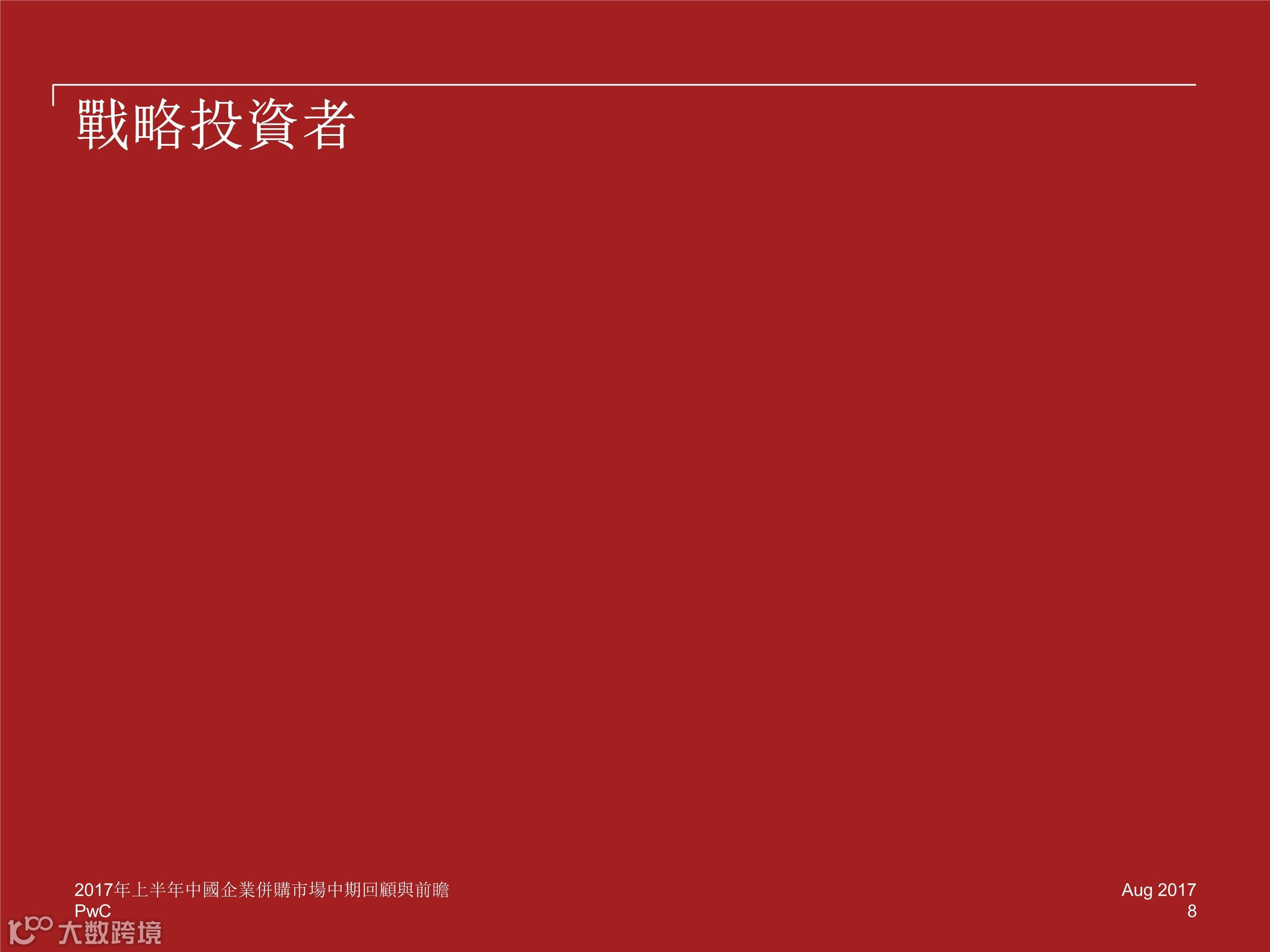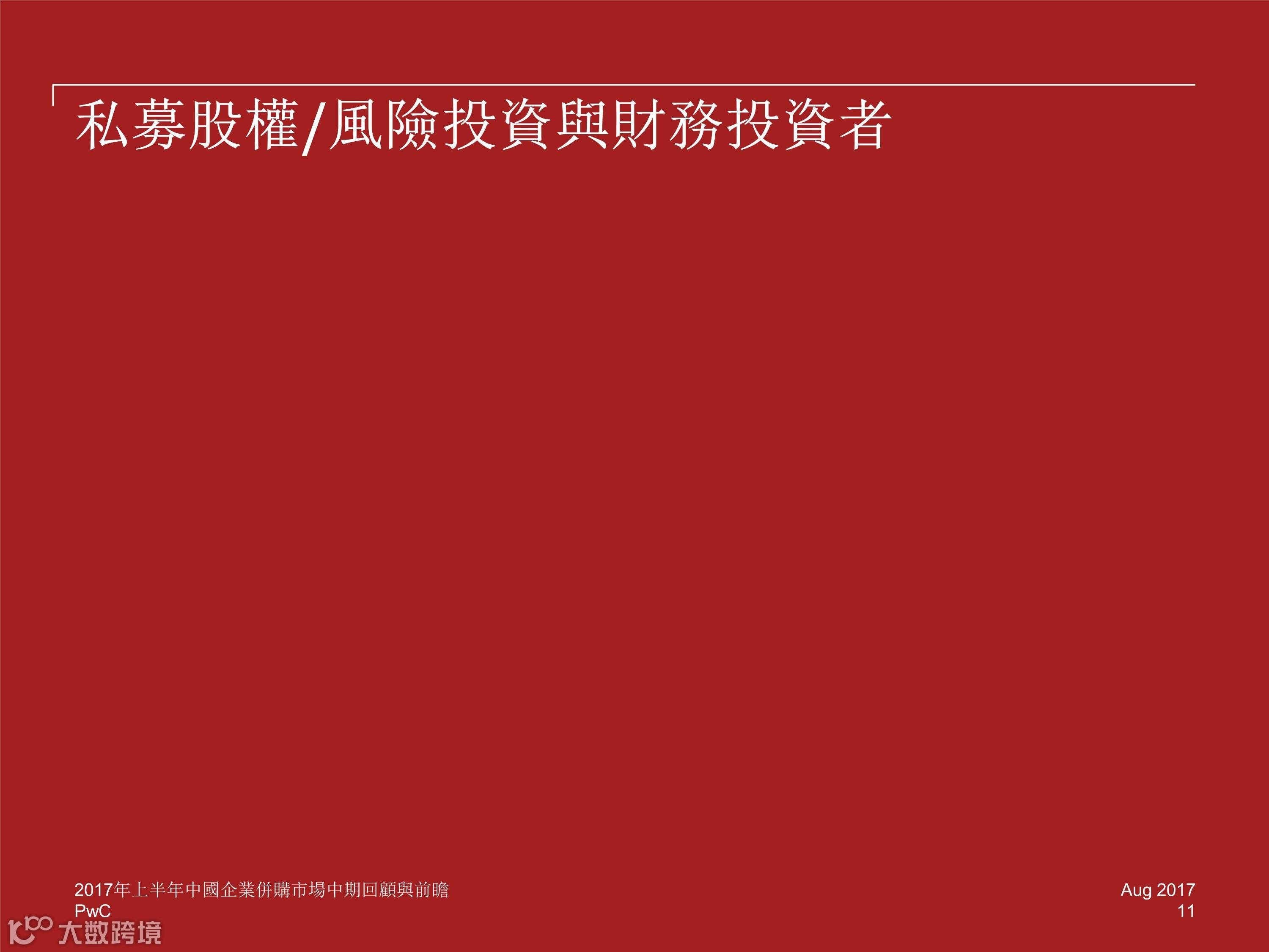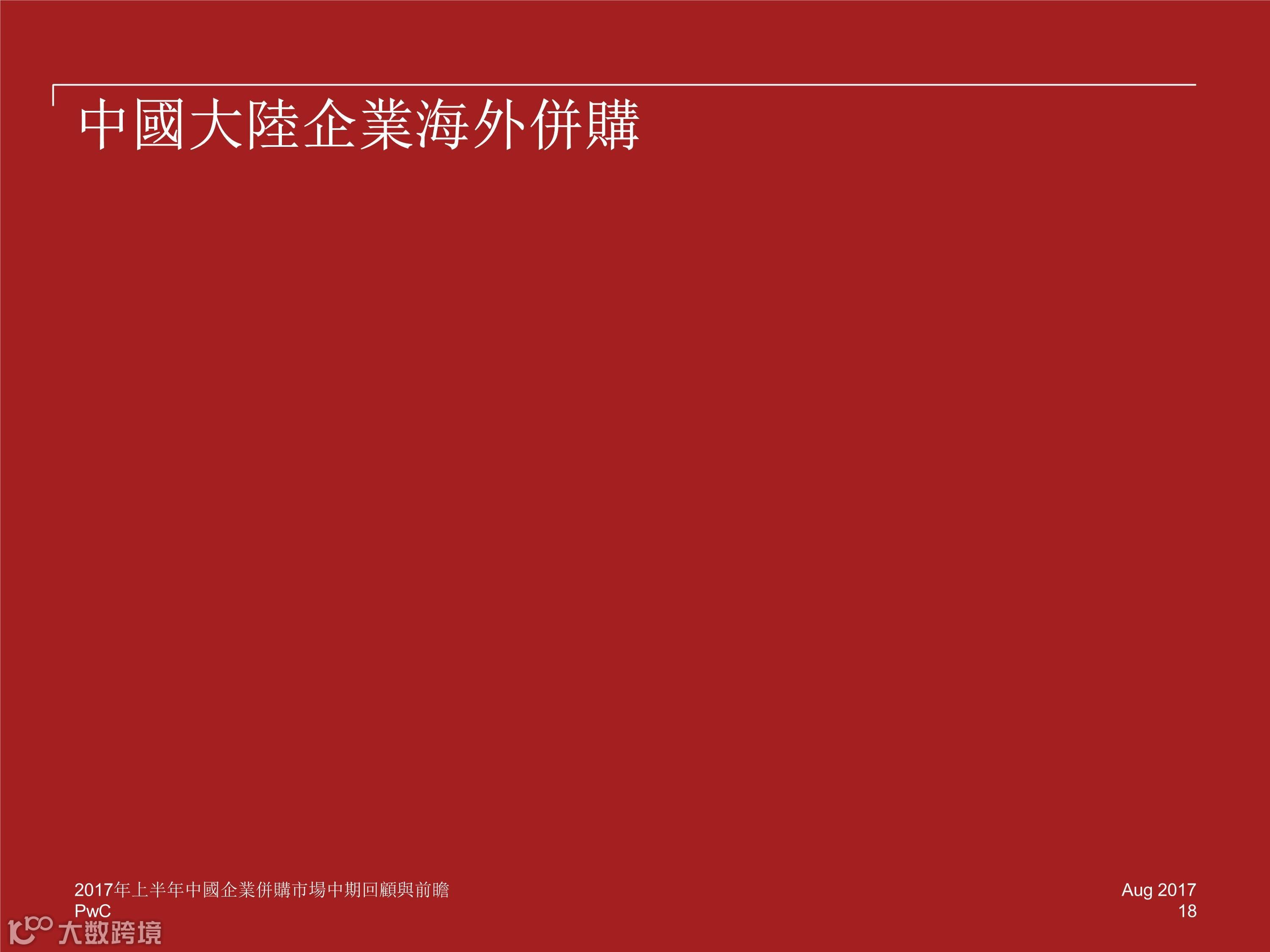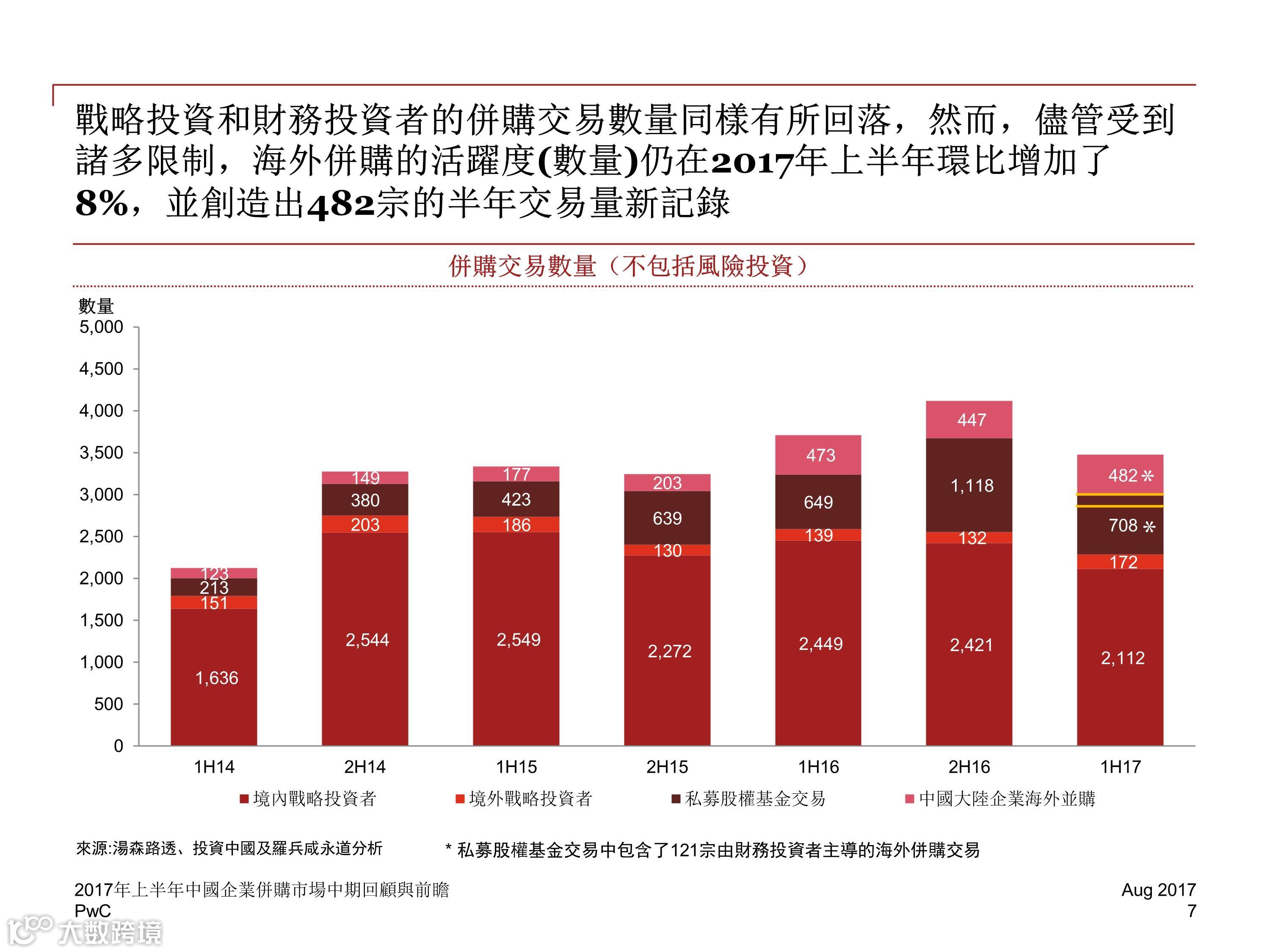 战略投资和财务投资者的并购交易数量同样有所回落,然而,尽管受到诸多限制,海外并购的活跃度(数量)仍在 2017 年上半年环比增加了 8%,并创造出 482 宗的半年交易量新记录。