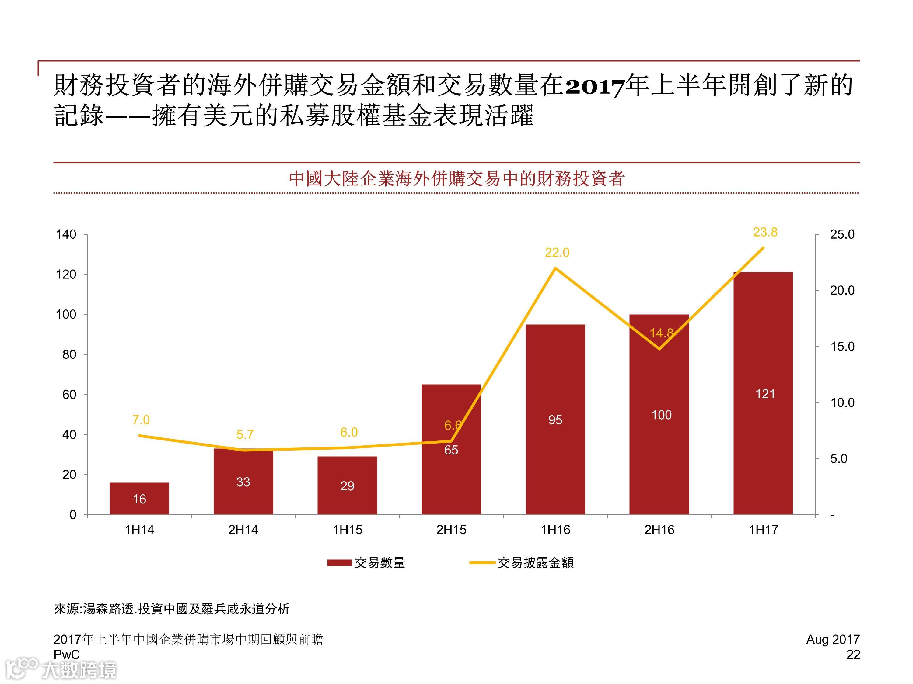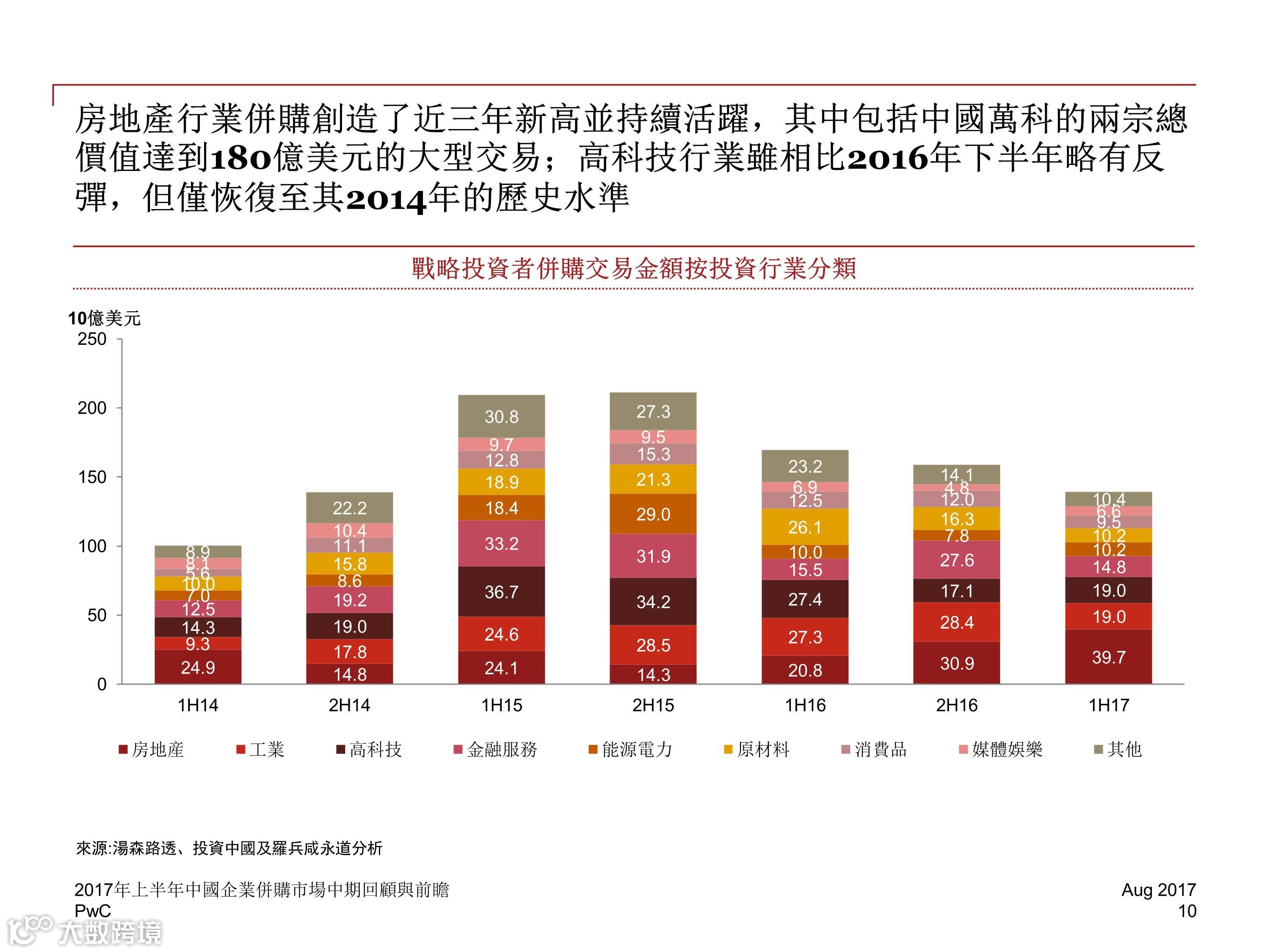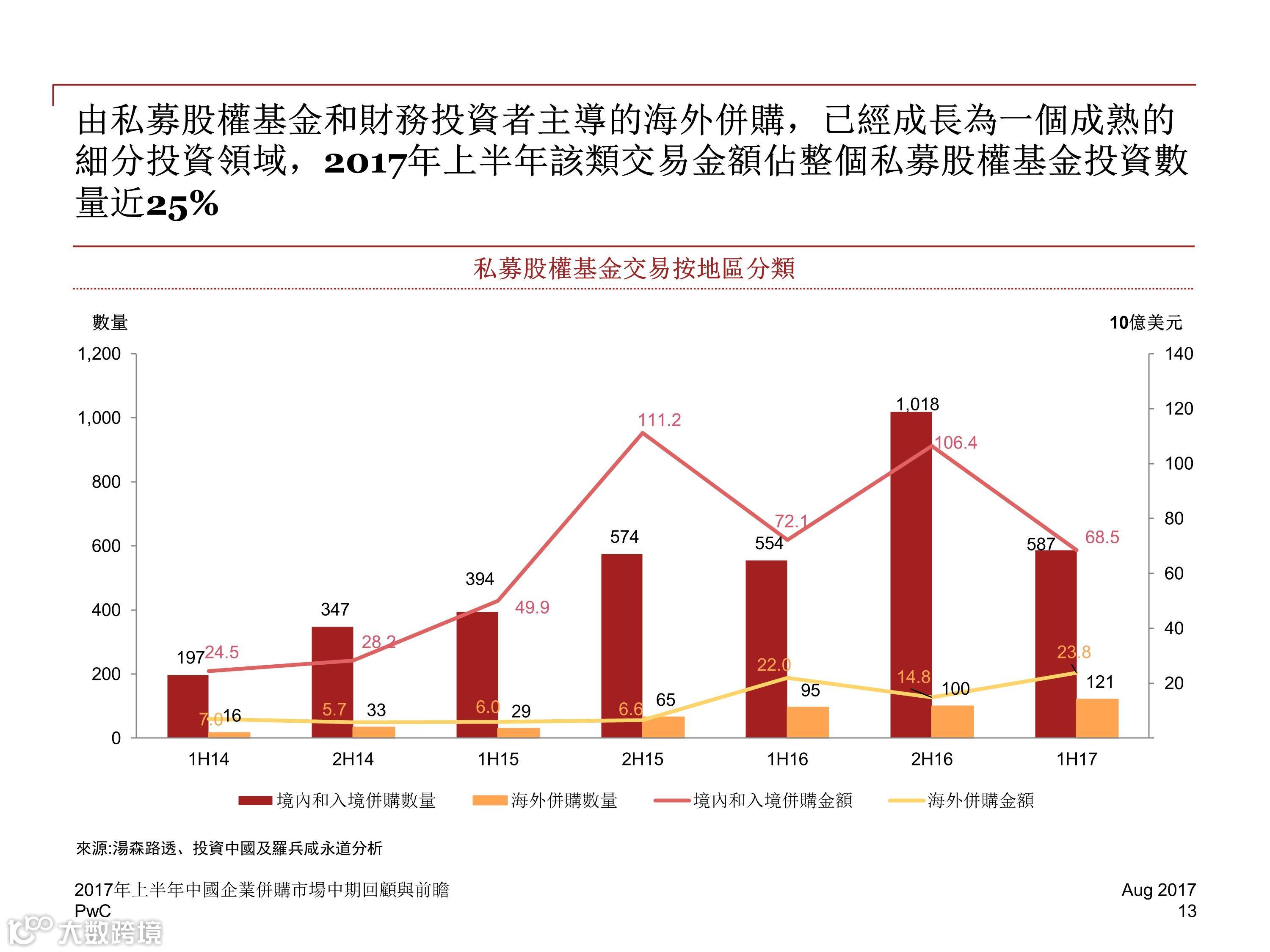 战略投资和财务投资者的并购交易数量同样有所回落,然而,尽管受到诸多限制,海外并购的活跃度(数量)仍在 2017 年上半年环比增加了 8%,并创造出 482 宗的半年交易量新记录。