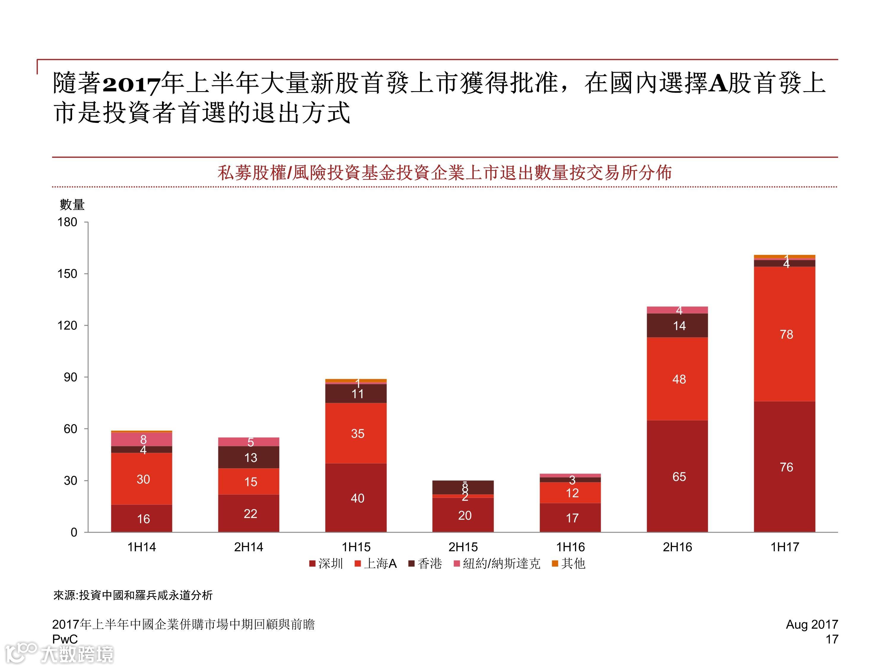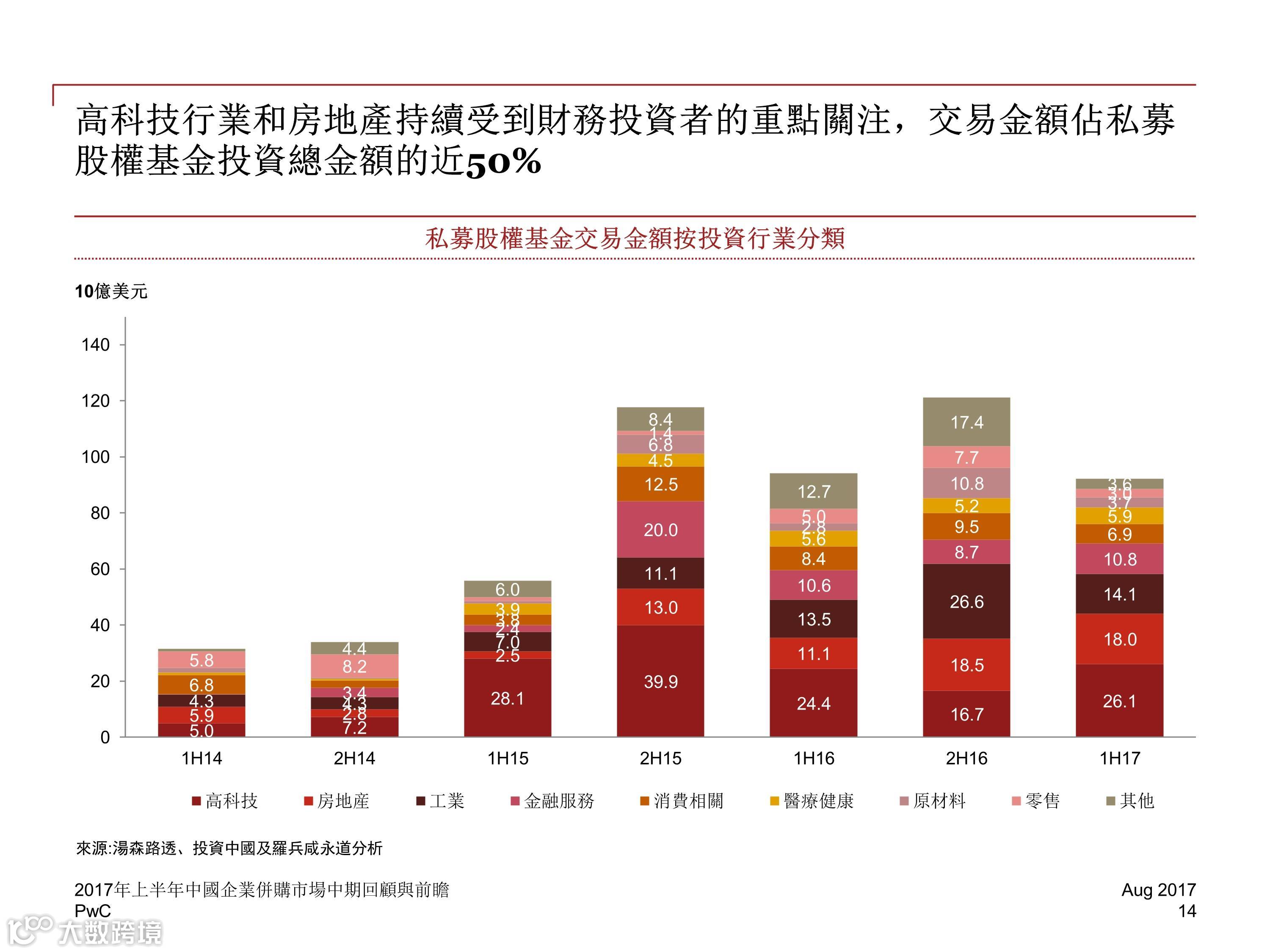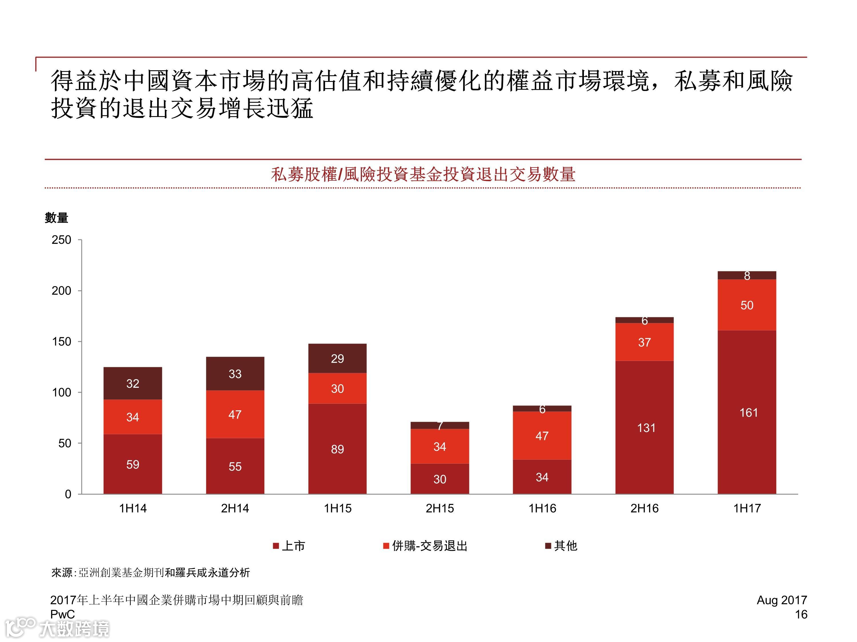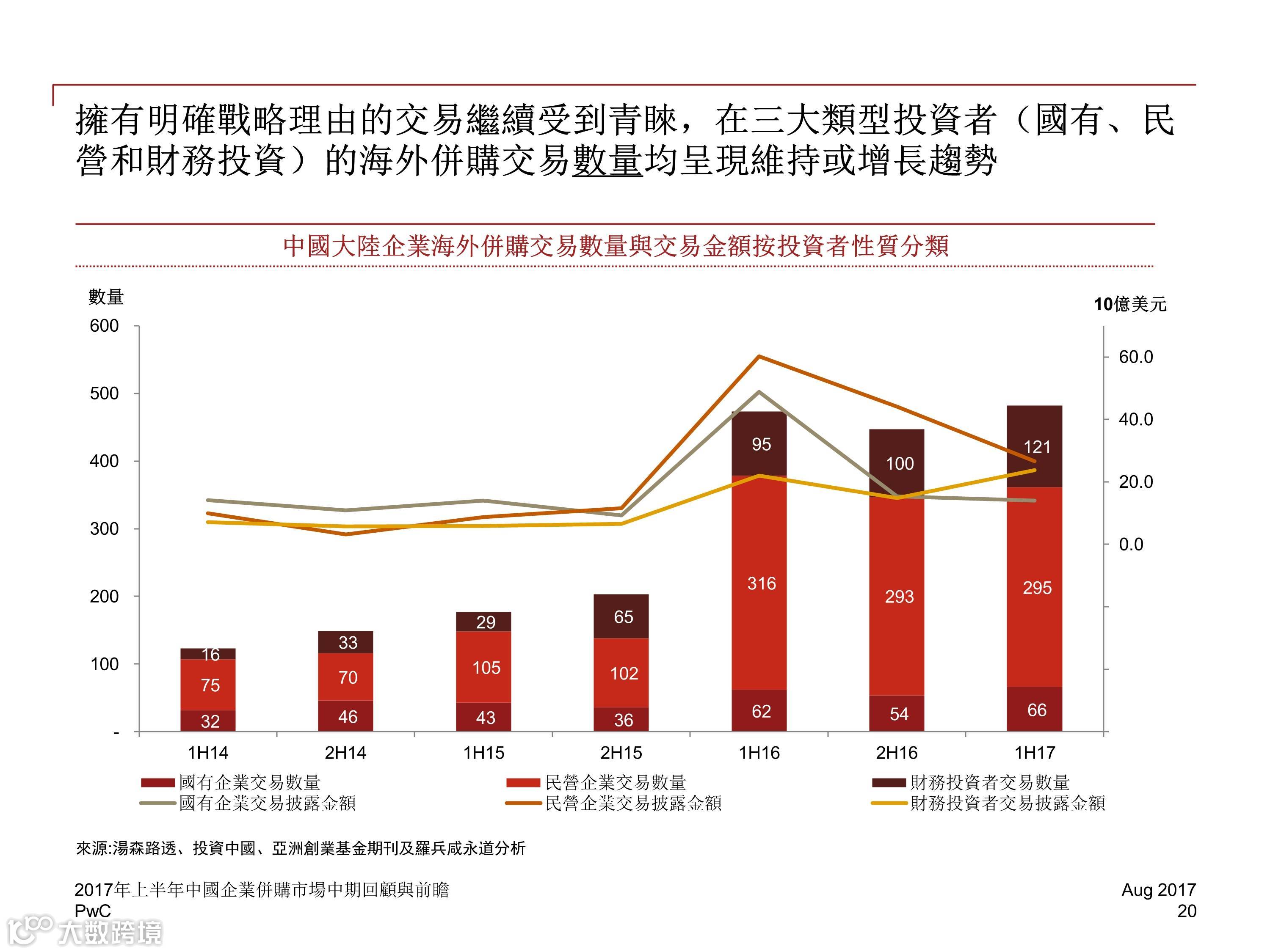 战略投资和财务投资者的并购交易数量同样有所回落,然而,尽管受到诸多限制,海外并购的活跃度(数量)仍在 2017 年上半年环比增加了 8%,并创造出 482 宗的半年交易量新记录。